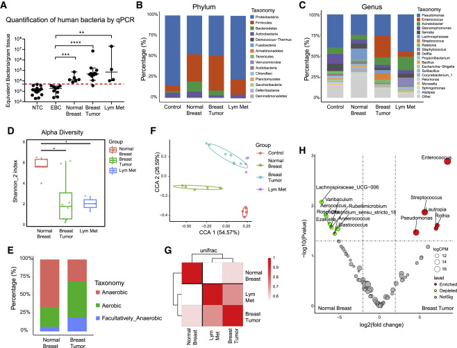 自发小鼠BT含有大量的活细菌研究人员通过16S测序全面描述组织驻留菌群的组成。对16S文库构建流程进行了优化,通过添加生物素富集步骤来减少非特异性基因组序列,比传统方法检测肠道菌群的灵敏度显著提高。据此,研究分析了正常组织和肿瘤组织中的微生物群(图1)。无监督聚类分析显示,对照(NTC和EBC)、正常乳腺组织和BT组织具有明显的微生物群落(图1I)。阴性对照样品中大部分微生物为变形菌门(Proteobacteria,图1G和S1I),而组织样品富集为厚壁菌门(Firmicutes,图1G)。研究数据共同表明PyMT自发性肿瘤中含有大量的活菌。