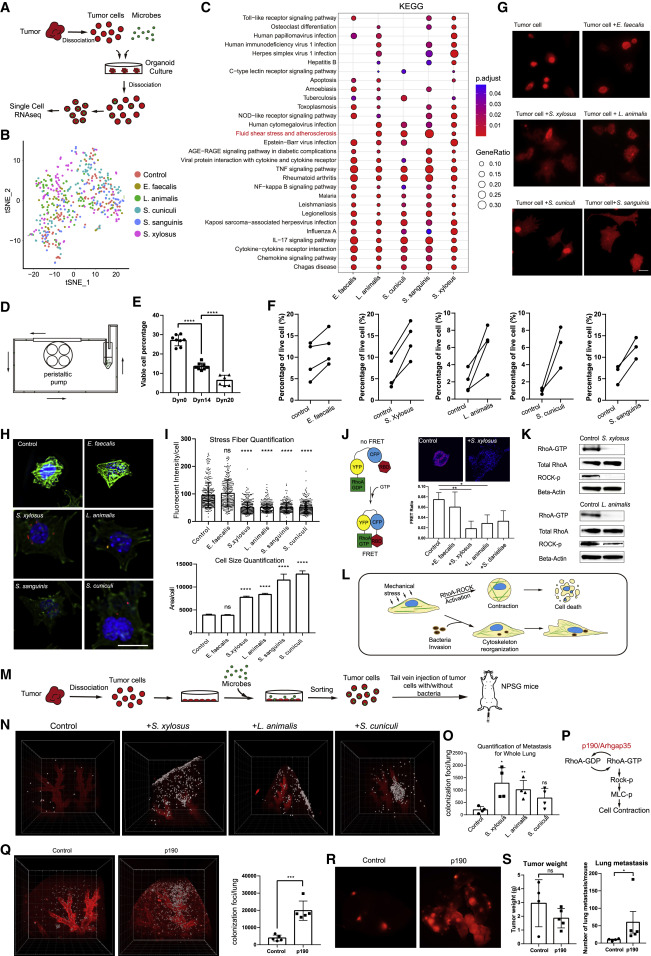 研究对从类器官培养中分离的细菌入侵癌细胞进行单细胞RNAseq分析(图6A)。 KEGG通路分析显示,被细菌入侵的肿瘤细胞开启了许多免疫相关信号,包括toll样受体信号通路、nod样受体信号通路、TNF信号通路、NF-κB信号通路、Th17信号通路、细胞因子趋化因子相关通路等(图6C)。有趣的是,研究发现木糖拟南芥、动物拟南芥、兔丘拟南芥和马血拟南芥对肿瘤细胞的侵袭特异性地触发了流体剪切应力途径。